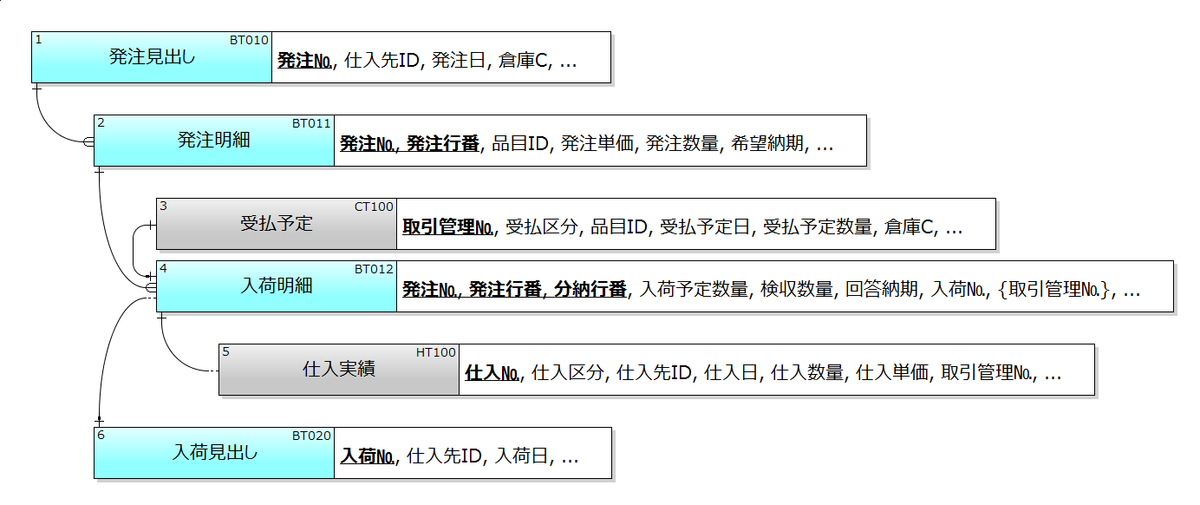具体例を挙げよう。図1は発注・入荷の典型的なデータモデルで、私が書籍やブログでも何度か紹介しているパターンだ。「発注見出し」と「発注明細」にもとづいて発注内容を伝えると、仕入先から納期回答があるので、その内容を「入荷明細」として登録する。入荷明細は今後の在庫推移を変動させる要素のひとつとなると同時に、実際に入荷して検収されれば仕入計上の起点にもなる。未来の在庫推移を把握したい業態にとっては強力なパターンだ。