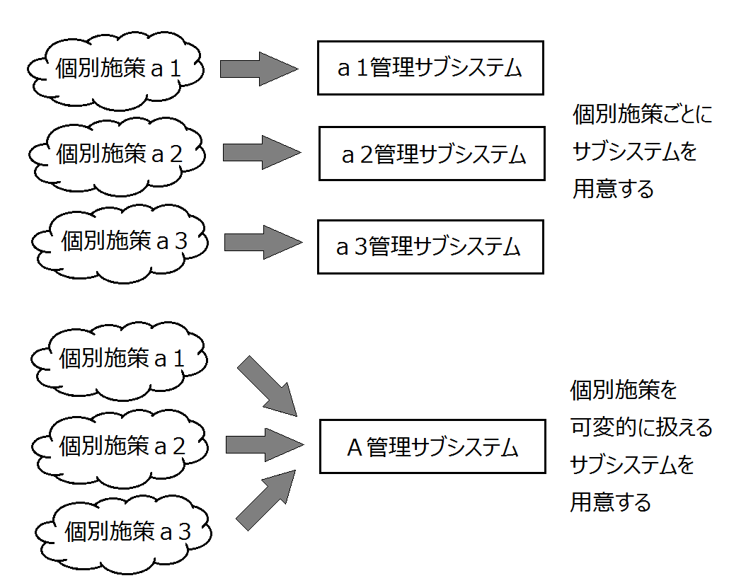 もうひとつの原因は、図1の上のような発想で仕様化しているためではないかと私はにらんでいる。個別施策毎に専用のサブシステムを仕様化するのではなく、単一サブシステムの中で個別施策を自由に定義して扱える枠組みを創造する必要がある。