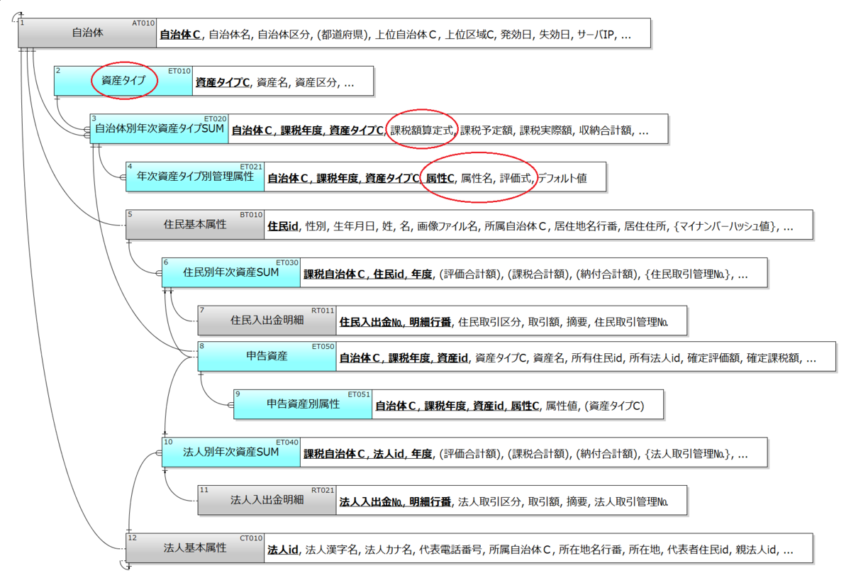 赤丸で囲った部分に注目してほしい。事前に資産タイプ(2,モデル上のテーブル番号)が定義されており、各自治体は年度毎に資産タイプ向けの計画を課税額算定式とともに設定する(3)。計算式には多彩な計算要素が含まれるが、それらは年次計画毎に資産の属性一覧としてあらかじめ設定されている(4)。住民および法人が申告した資産には規定の属性が設定され、評価額と課税額が決定される(8,9)。紛らわしいが4の「評価式」は、資産の評価額を計算するための式ではなく、各資産(8)に付与される属性(9)がとる値の妥当性評価のための式である。資産評価額の設定式は別途用意したほうがよさそうだが、部分的には手作業での入力が避けられないかもしれない。