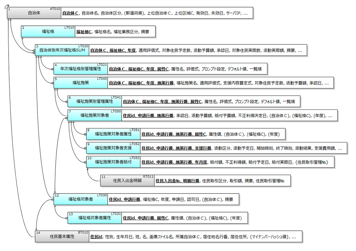 いかがだろう。以上の説明では「どのような情報が扱われるか」が語られているが「業務フローの標準化」は問題にされていない。なぜなら、データモデルを刷新することで業務フローは不可避的に変化するからだ。最初から業務フローの見直しを意図しているわけではない。また、このデータモデルが現行自治体システムのDB構造とは似ても似つかないという事実も知ってほしい。自治体活動においてどんな情報が扱われ、それがどんな論理構造を持っているか。それを抜本的に考え直すことで、ようやく業務フローの標準化や自治体DXの出発点に立てる。