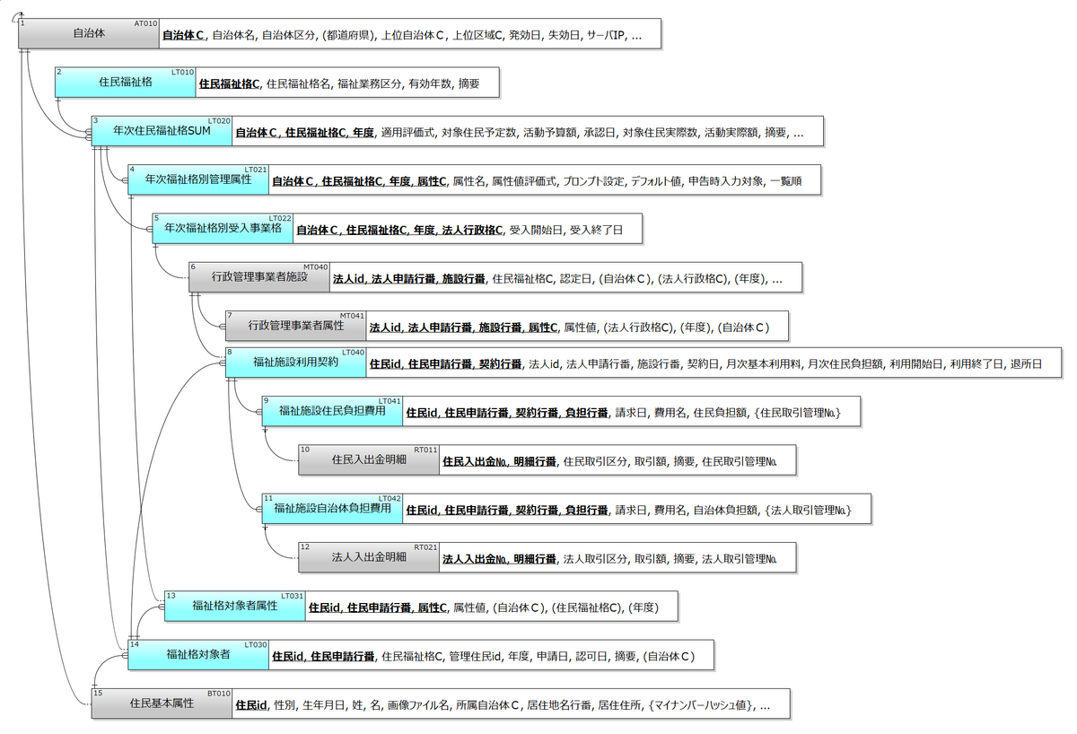 わかりやすさのためにタイトルを待機児童の話っぽくしたが、医療福祉、老人福祉、介護福祉、障碍者福祉、生活保護といった広い業務分野をカバーするものだ。福祉事業者の許認可、利用待機住民の把握、適合施設への誘導、利用料の納付や支払といったさまざまな業務を支援するデータモデルを考えたので紹介したい。