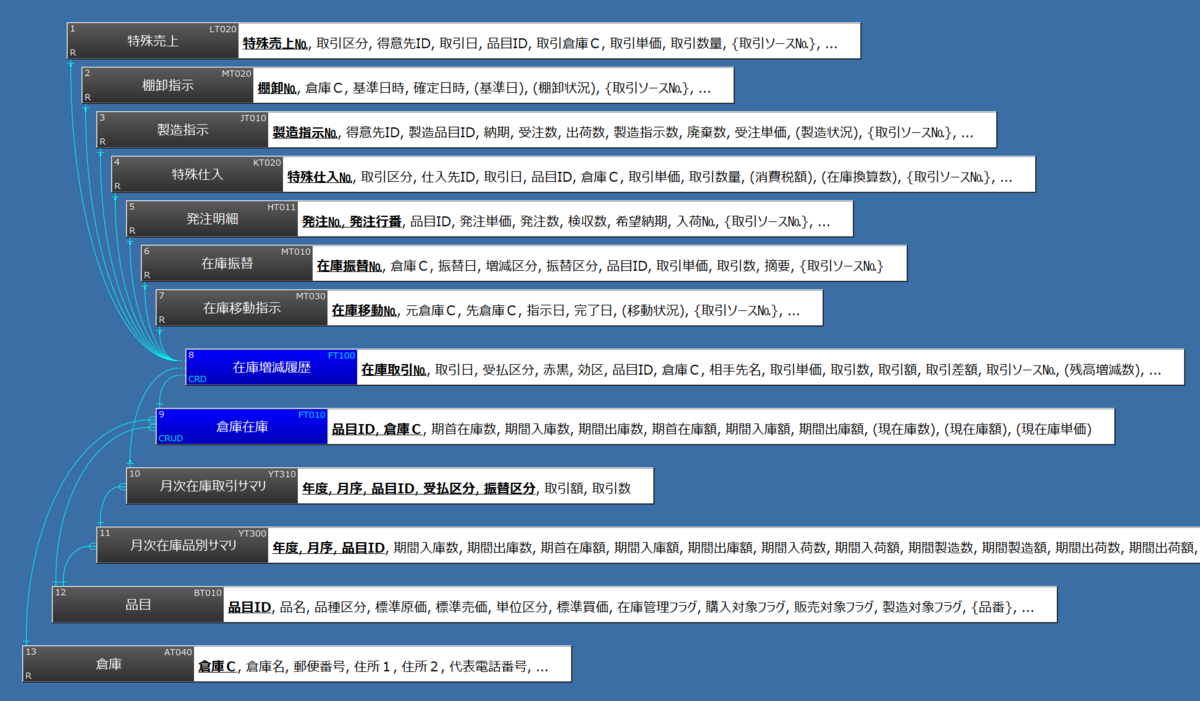 倉庫在庫(9)上の項目を使って説明しよう。期間入庫数、期間出庫数、期間入庫額、期間出庫額、の4項目は本来は導出属性なのだが、論理モデルの段階で実フィールドにされている。いっぽう、現在庫数、現在庫額、現在庫単価の3項目はカッコ付きなので論理フィールドとされていることがわかる。