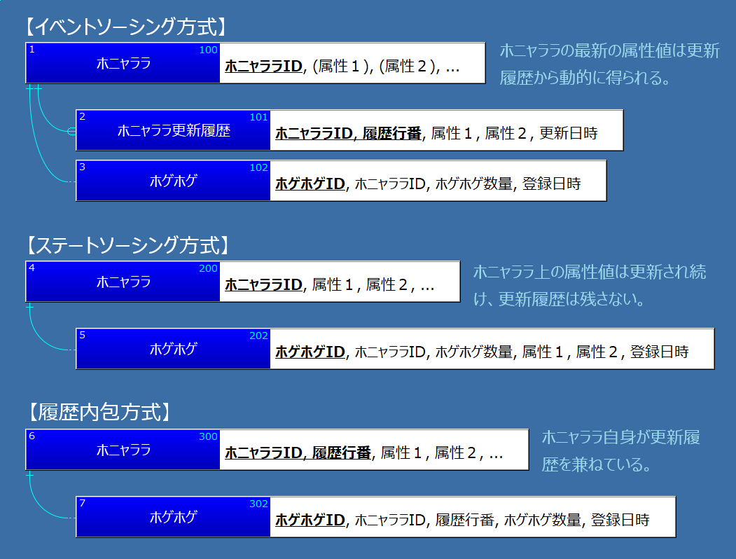 イミュータブルデータには、関連する管理テーブルが1個か複数個存在し、それらの関係においてイベントソーシングの考え方が適用される。よくある例として、マスターテーブル(ホニャララ)とその更新履歴の関係で説明しよう(図1)。各方式の特徴を強調するために、ホニャララを参照するテーブルが1個(ホゲホゲ)が置いてある。